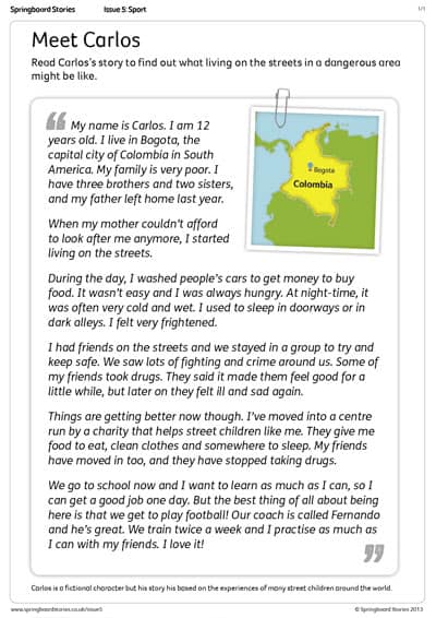 Explore what life is like for street children around the world and look at how the beautiful game is giving new hope to children such as Carlos. Encourage the children to compare Carlos's life with their own. Though there are many differences children will recognise his hopes and fears which are probably much like their own.