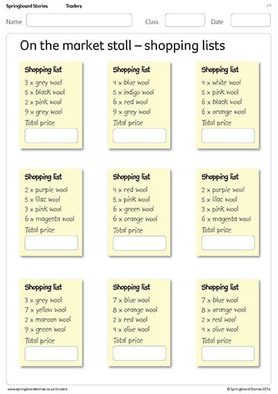This resource helps with problem solving and multiplication and addition skills. Can the children help Mrs Bannerjee with her customer orders? Each shopping list shows what each customer would like to buy. Can they work out the total cost for each order? Display the wool prices on your whiteboard, hand out the shopping lists and either work on the activity sheets or in designated maths books.