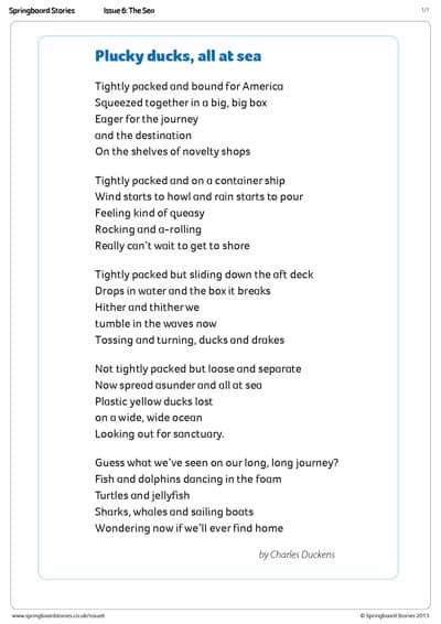 Start your Plucky ducks lesson with the 'Plucky ducks, all at sea' poem or use as inspiration for your own poetry. You can either empathise with the ducks or look at the environmental issues highlighted by our story.