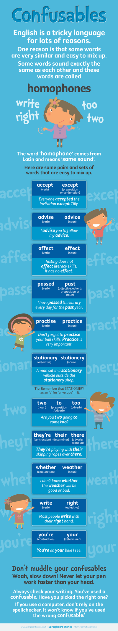 It will help explain some of those tricky homophones and other confusable words... and offers a little bit of valuable advice about not letting your pen work faster than your head.