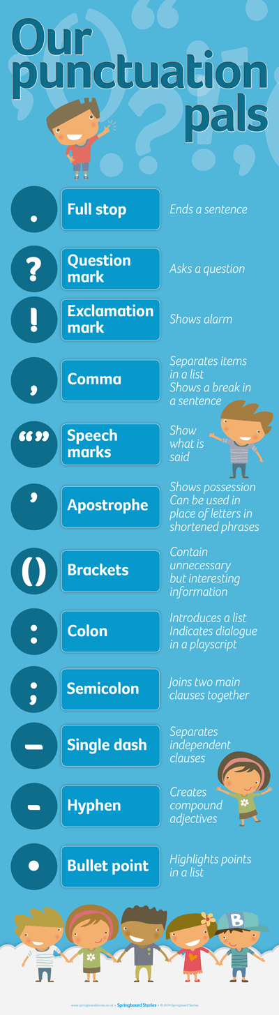 Show that punctuation marks are our pals with this infographic to explain twelve of our ever-useful punctuation marks.
